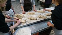 Alle Jugendlichen mussten sich als erstes die Hände waschen und bekamen Schürzen. Sie kneteten den Teig und vermengten ihn mit Mehl. Zwei Jungs durften auch eine Maschine zum Glätten des Teigs bedienen. Anschließend wurden die Laibe auf persönliche Weise verziert. Zusammen schob man sie in den begehbaren Ofen.