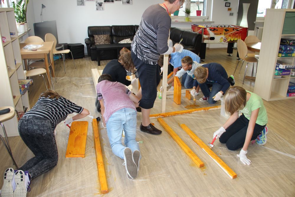 Konfirmanden gestalten eine Bank für Bestwig
