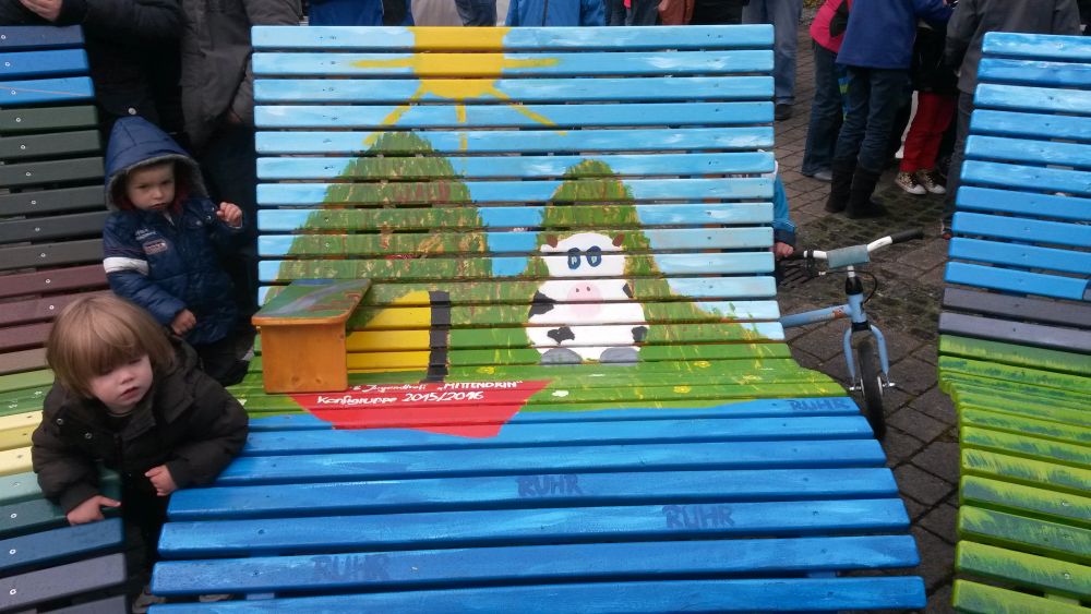 Die Bank für Bestwig wurde von Kindern aus dem Jugendtreff ‚Mittendrin’ und Konfirmanden aus unserer Gemeinde zusammengebaut und angemalt. Die pädagogische Leiterin Silke Wippermann und Pfarrer Frank Mönnig sind stolz auf das Ergebnis. Die kleinen Künstler trafen sich wiederholt im Jugendtreff und gingen energiegeladen ans Werk. Mit dem Sauerland, da verbinden sie vor allem die grünen Landschaften, die von Flüssen durchzogen werden, wie man auf der Bank sehen kann.